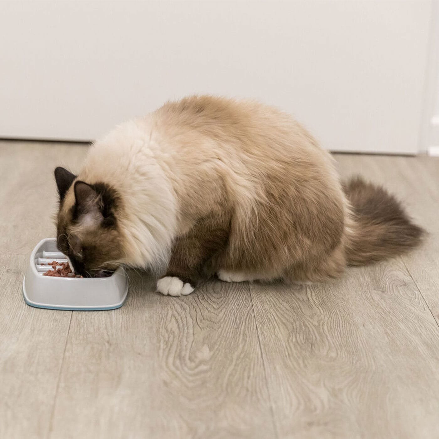 Lėto valgymo dubenėlis padeda išvengti pernelyg greito maisto rijimo, taip sumažindamas virškinimo sutrikimų riziką. Tinka visų rūšių sausam maistui ir konservams. Neslystantis dugnas užtikrina dubenėlio stabilumą valgymo metu. Produktas patikrintas nepriklausomos gyvūnų gerovės ir apsaugos ekspertų institucijos. Tinkamas plauti indaplovėse.