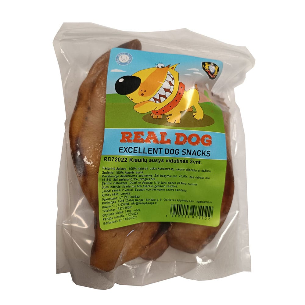 Real Dog natūralios džiovintos kiaulės ausys, skanėstas šunims, 3 vnt