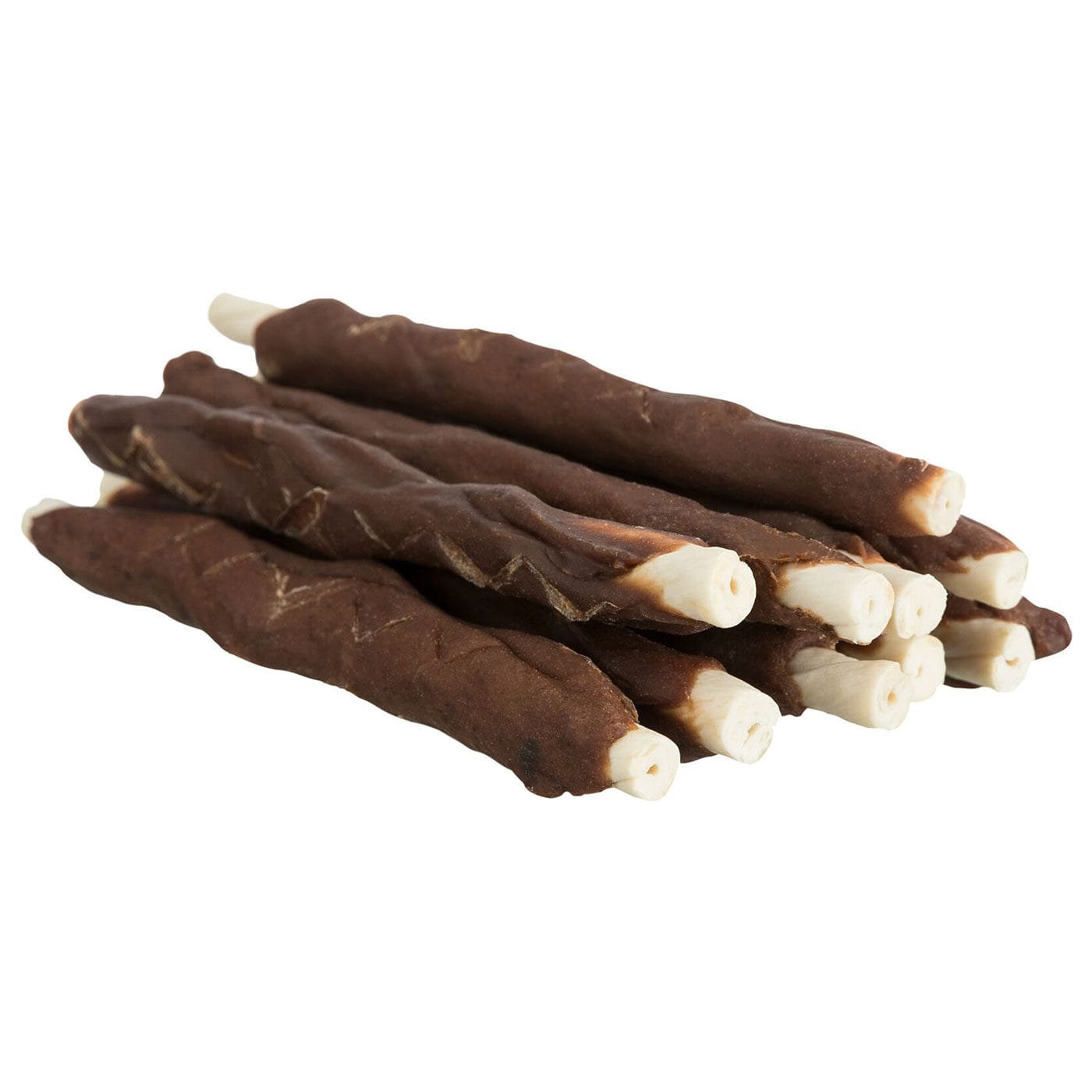 Skanėstas šunims. Pagaminti iš 100 % džiovintos galvijų odos. Apvynioti triušienos mėsa. Ilgis: 12 cm. Pakuotėje 6 vnt kauliukų. Be glitimo. Be pridėtinio cukraus.