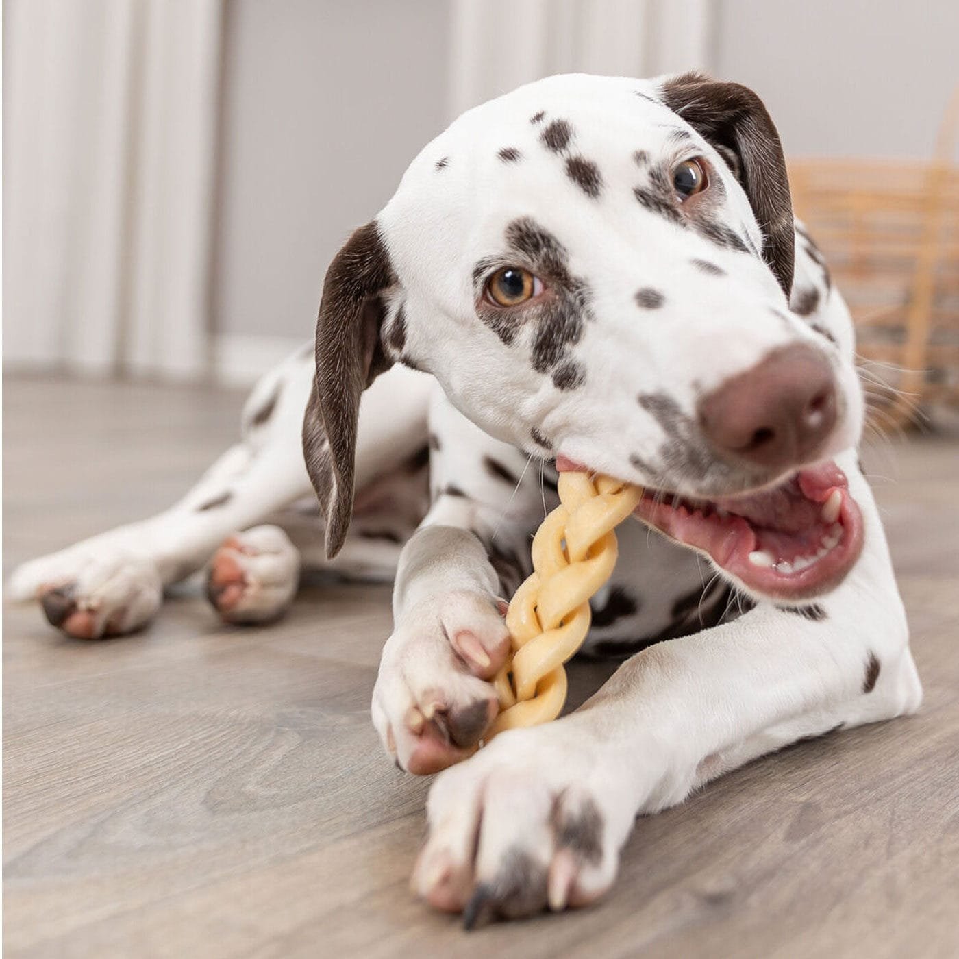 Skanėstas gali skilti – stebėkite, kad šuo jį graužtų, o ne rytų. Yra užspringimo pavojus, todėl duodami šį skanėstą nepalikite šuns be priežiūros.