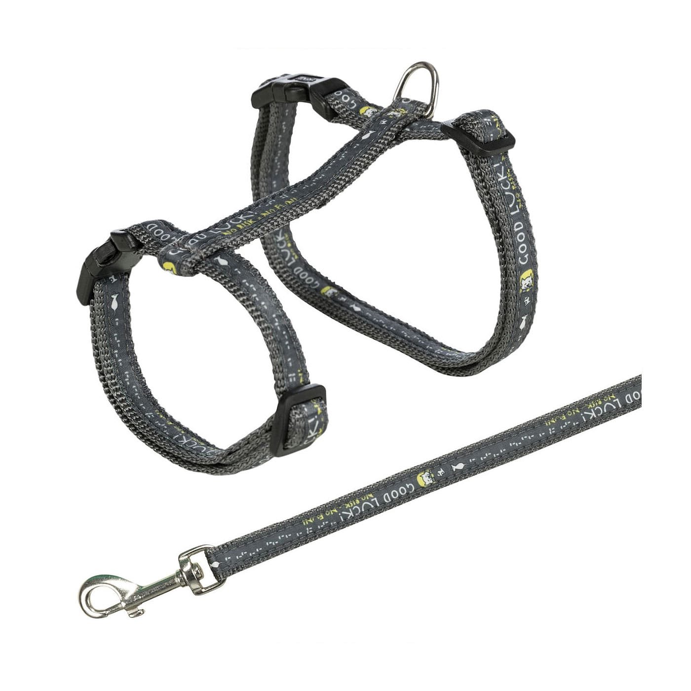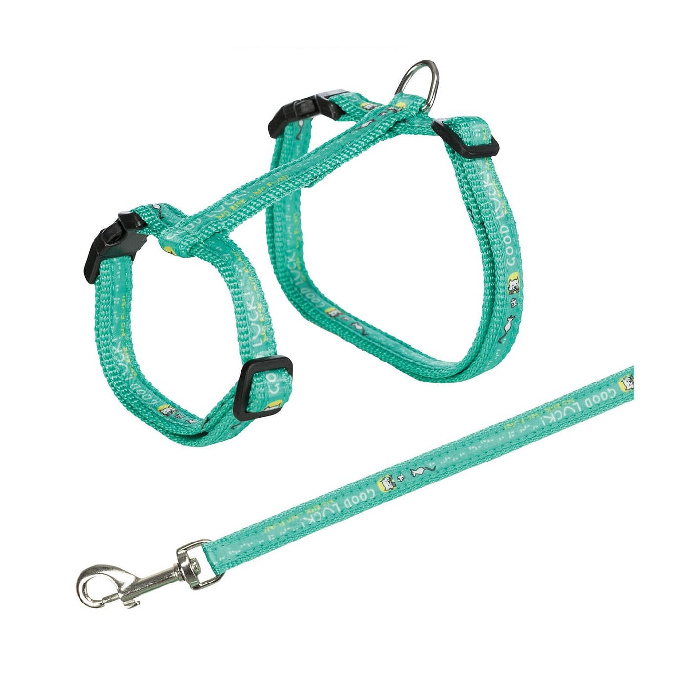 Reguliuojamo dydžio. Su greito užsegimo sagtimi ir minimalistiniu good luck užrašu ir katinukų dizainu. Tinkamos didelių veislių arba stambesnėms katėms. Produkto spalva parenkama atsitiktiniu būdu.